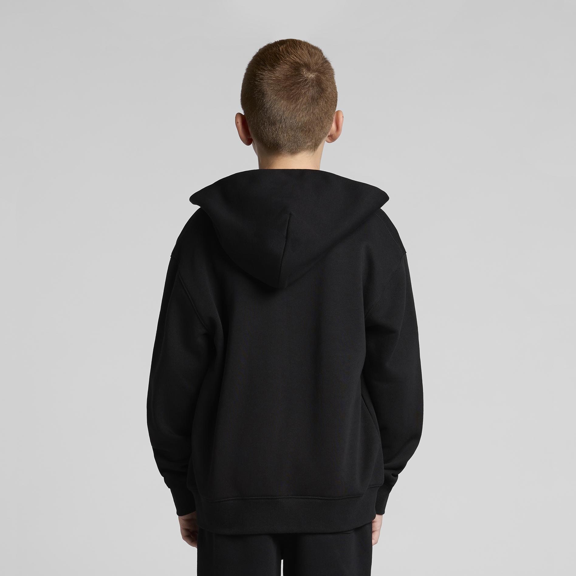 Construction: Zip hood, drop shoulder, kangaroo pocket, self-fabric lined hood, no drawcord, YKK zip, sleeve cuff ribbing